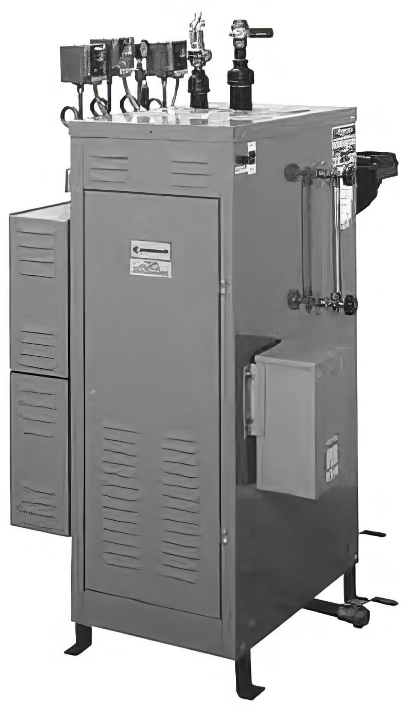 Provides high-quality (97%) vapor quality clean steam needed to power connected equipment. Automatic controls include heating section water level control and steam pressure controls to control operating pressure and monitor high-pressure limit. Auxiliary low water cut-off feature turns off heating element in event of water level control failure. Heating section insulated with 2″ thick glass fiber.