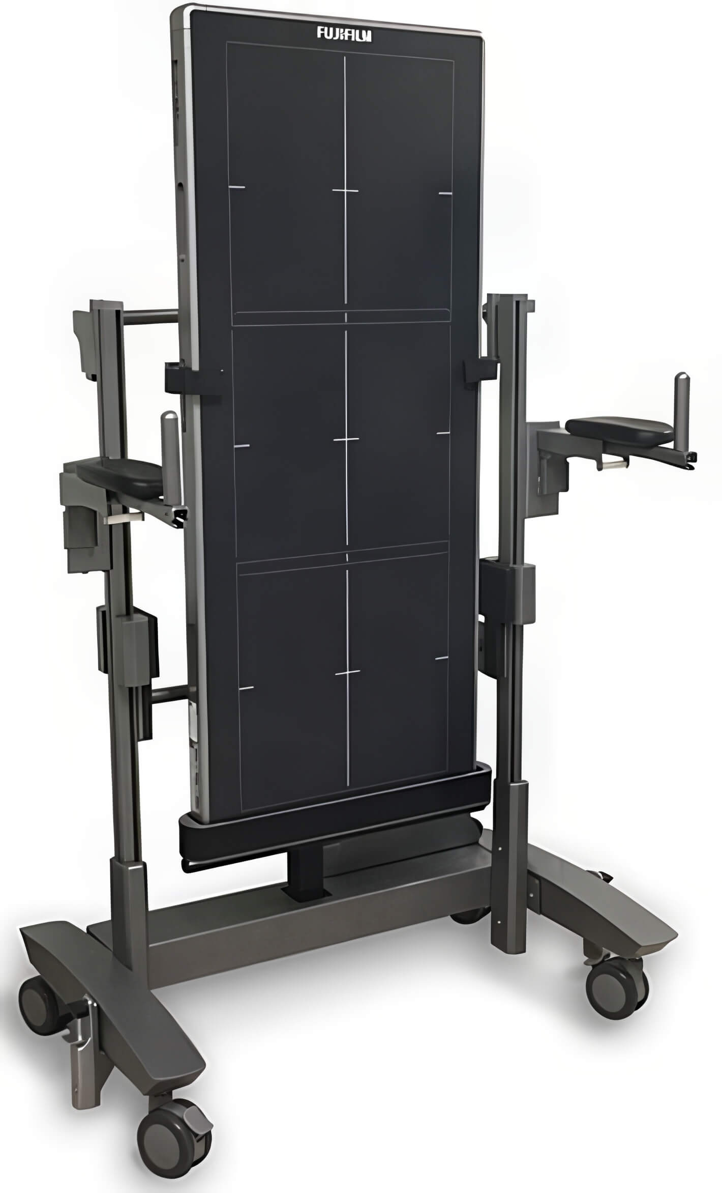 The Fujifilm FDR D-EVO GL 17×49” Full Spine Length Detector with rolling stand is engineered to provide seamless, high-quality long-view radiography in a single exposure, significantly enhancing workflow efficiency and patient comfort. Its expansive 17×49-inch imaging area extends the traditional long-length field of view by three inches, accommodating a wider range of patient sizes and reducing retakes caused by anatomy cutoff. Incorporating Fujifilm’s advanced Dynamic Visualization processing, the detector delivers exceptional detail with optimized contrast and window/level capabilities. The patented ISS (Irradiated Side Sampling) technology positions the capture electronics on the irradiation side, dramatically reducing scatter and attenuation, which results in sharper images at lower doses—up to 50% less when used with Virtual Grid software. Enhanced noise reduction circuitry improves sensitivity, especially in dense areas like the mediastinum, providing a 1.7 times higher Detective Quantum Efficiency (DQE). The SmartSwitch feature enables automatic detection for quick, seamless imaging, while the lightweight design (about 43 lbs) and fast readout times (as low as 6 seconds for a 17×17 segment) make it ideal for long-view radiography, outpatient clinics, and mobile imaging environments.