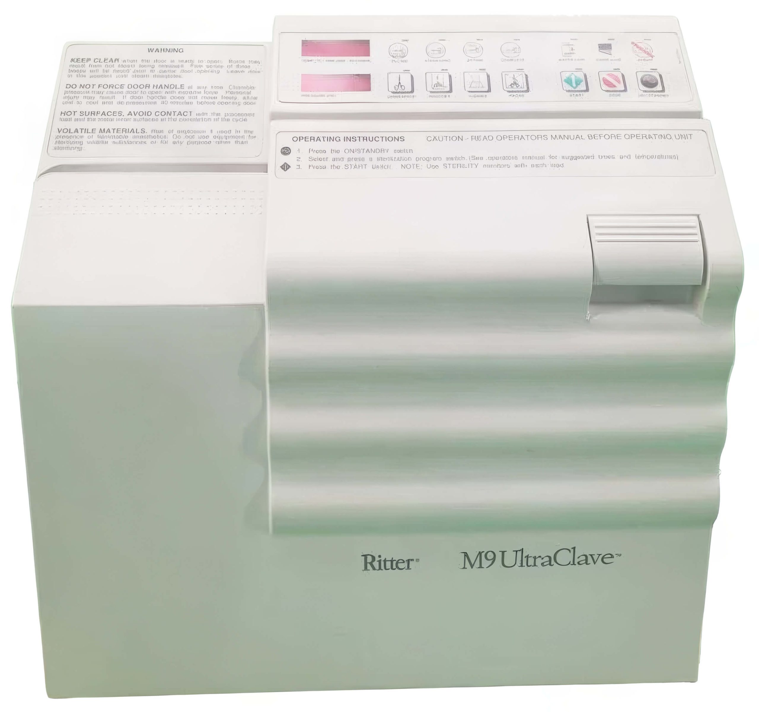 The M9 autoclave couldn’t be easier and is time tested for reliability. You simply load it – set it – and forget it. Select your cycle and the time is set for you. Press “Start” and the M9 fills with the correct amount of water. Once the sterilization process is complete, the door opens automatically and quietly to dissipate the steam, giving you fast drying time for your instruments.