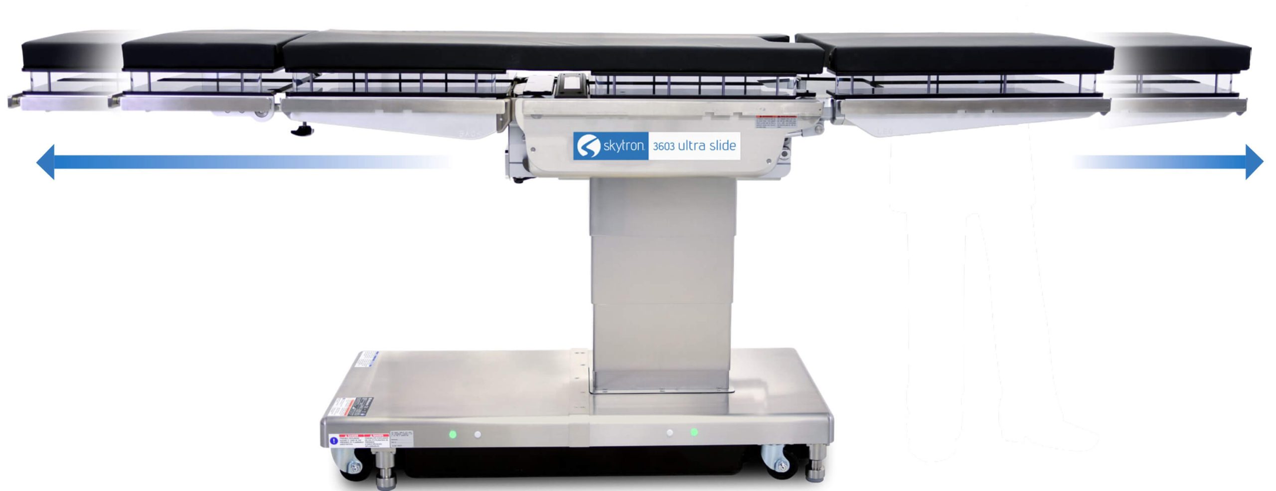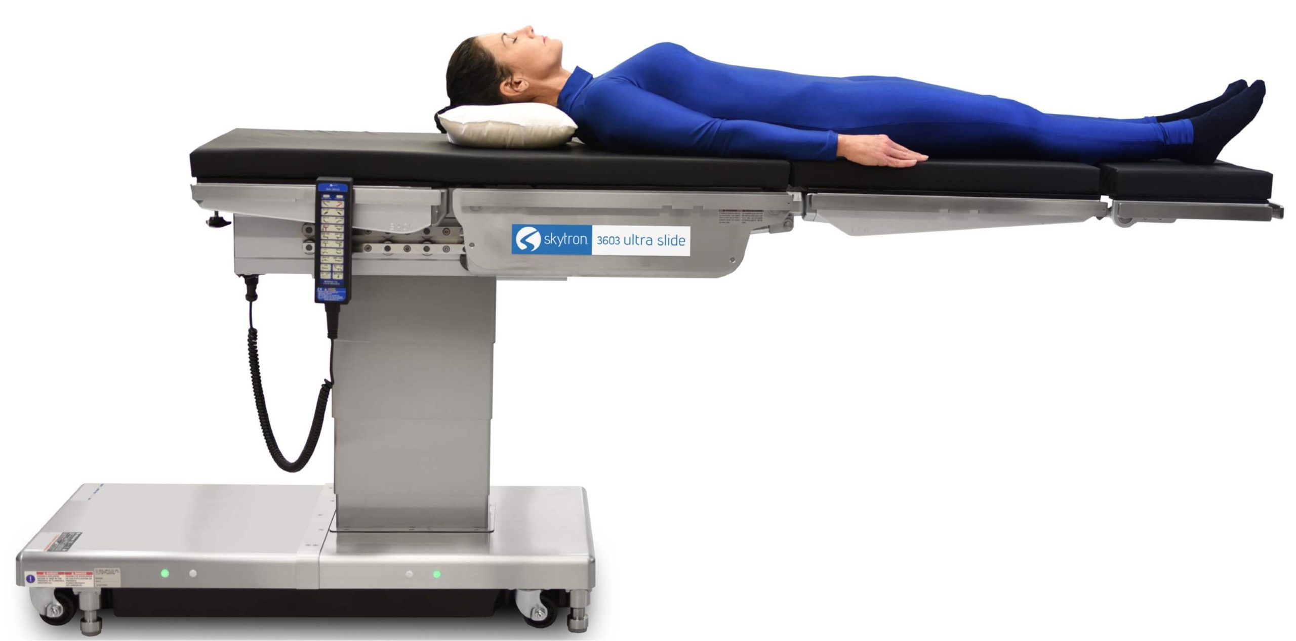 The Skytron Ultra Slide 3603 represents the visionary benchmark in Top Slide surgical table design, including even greater imaging versatility, lift and articulation power. Expanded features provide optimal patient positioning and C-arm access with 26” Top Slide, 800lb lift. articulation and full table functions.